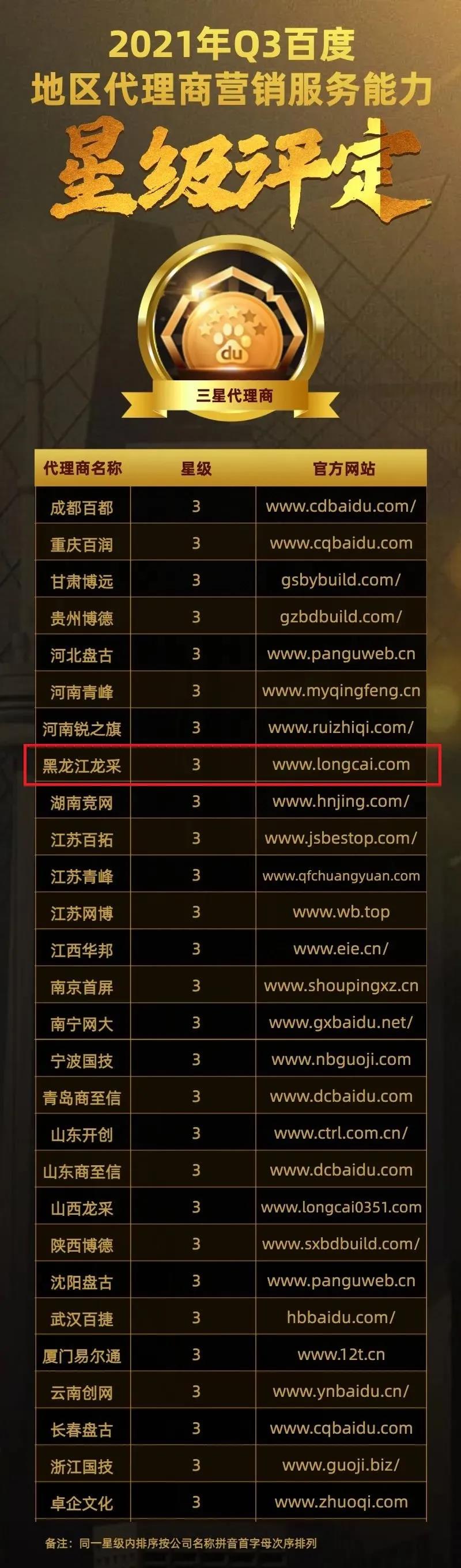 經(jīng)百度認(rèn)證評(píng)選團(tuán)的層層篩選,2021年Q3百度地區(qū)代理商營銷服務(wù)能力星級(jí)評(píng)定結(jié)果已經(jīng)出爐。黑龍江龍采以優(yōu)異的專業(yè)能力、創(chuàng)新的實(shí)踐能力以及廣告主高分滿意度榮獲“三星”代理商稱號(hào)!