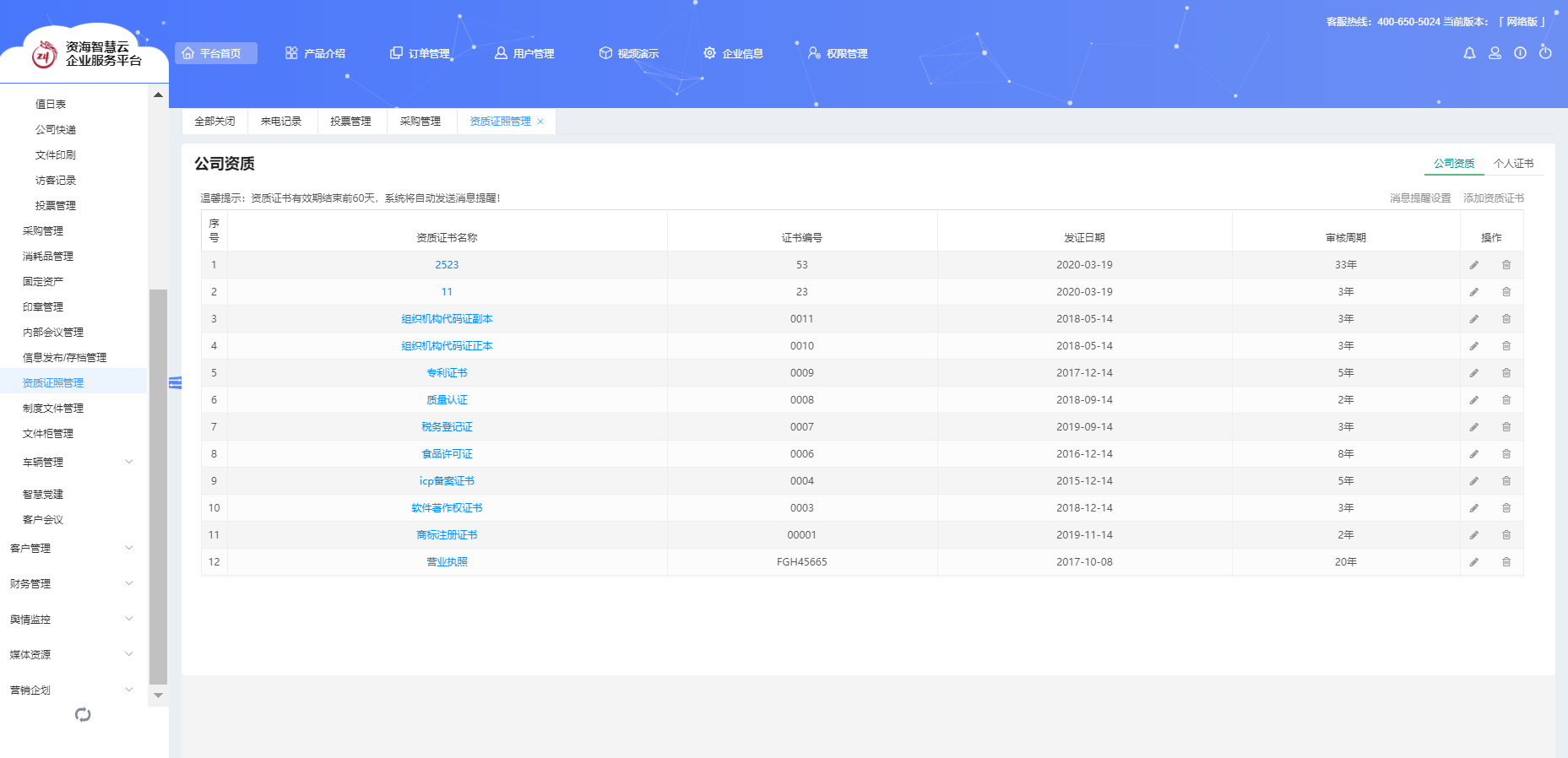 資產(chǎn)物料管理、文件柜管理、采購管理、資質(zhì)證照管理、印章使用管理、文件打印管理、會議管理、制度文件管理、信息發(fā)布/存檔管理、車輛管理。