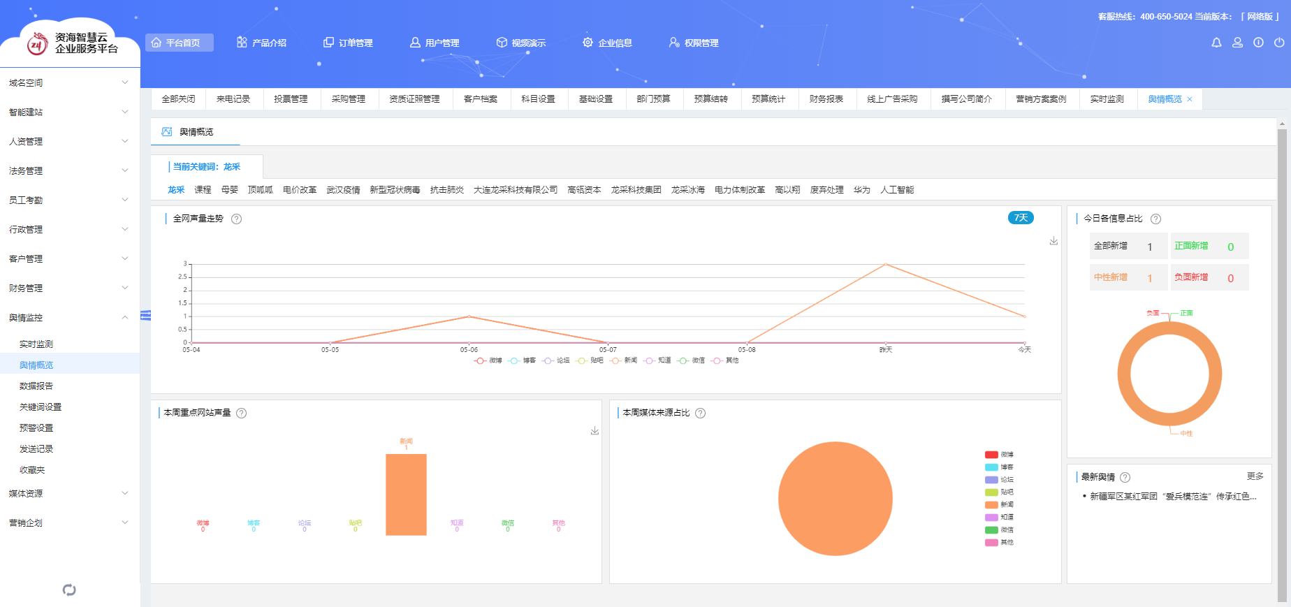 實時監(jiān)測、關(guān)鍵詞設置、輿情概覽、數(shù)據(jù)報告、全網(wǎng)搜索、預警設置、發(fā)送記錄、我的收藏。